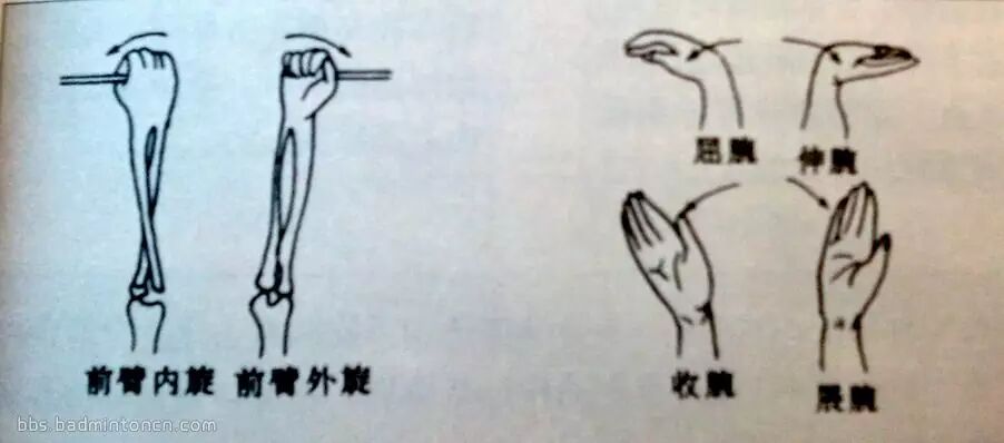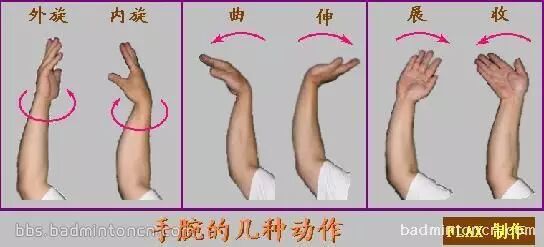 首先发一张手腕动作的图片,羽毛球的任何一个出球,都是手腕的两个动作的组合,如挑球发球就是从后伸腕到向上展腕,而初学者常常是直接曲腕去挑球,说到这里,也想请各位球友认真体会一下,杀球或高远后收拍时是采用哪种手腕动作呢?